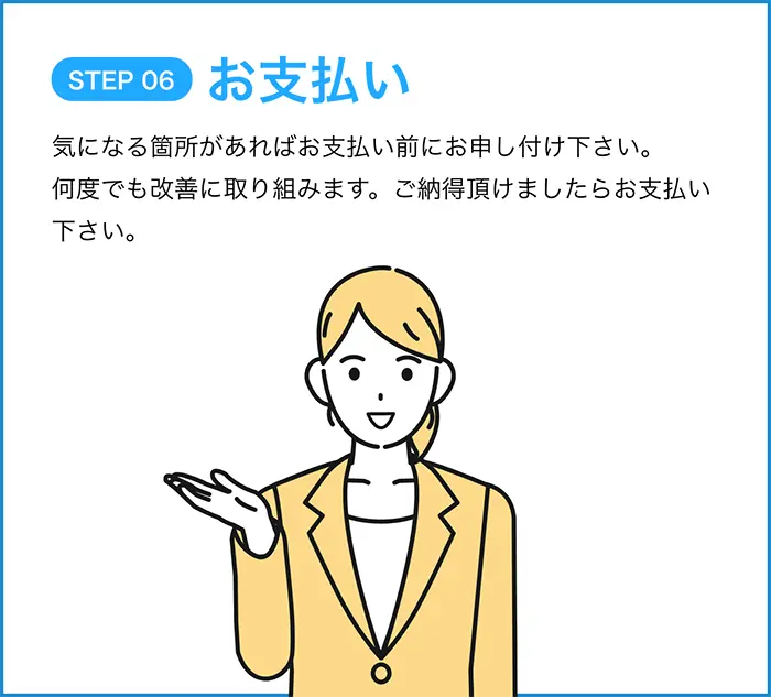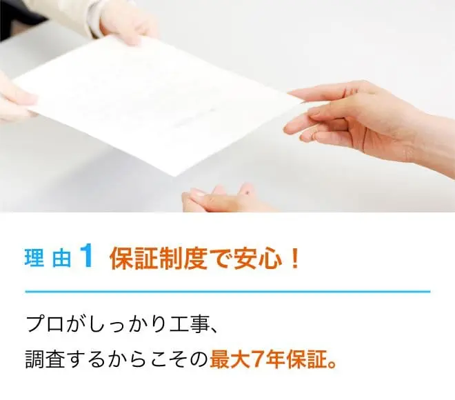 万が一工事による不具合が起きた場合に、再修理の作業料、技術料を無料で行わせていただきます。保証書は大切に保管下さい。