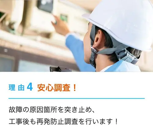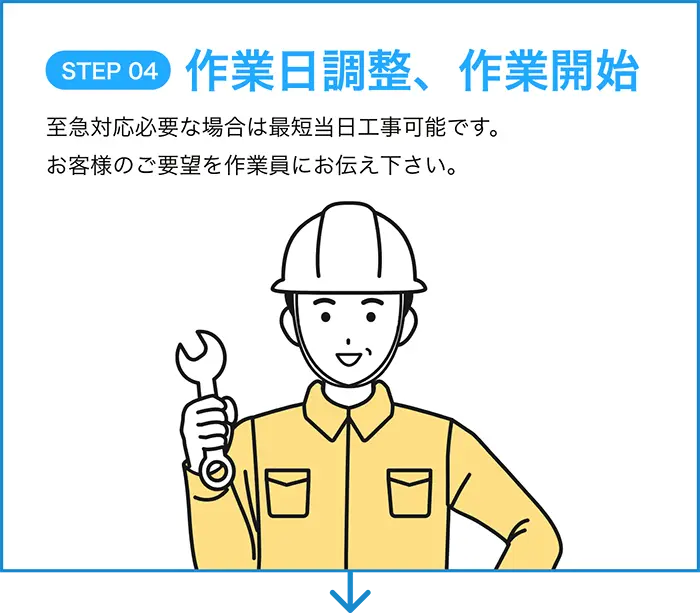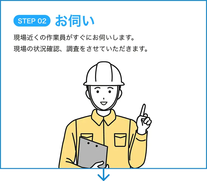 調査は1~2時間程度がほとんどです。工事は内容により大幅に変化します。