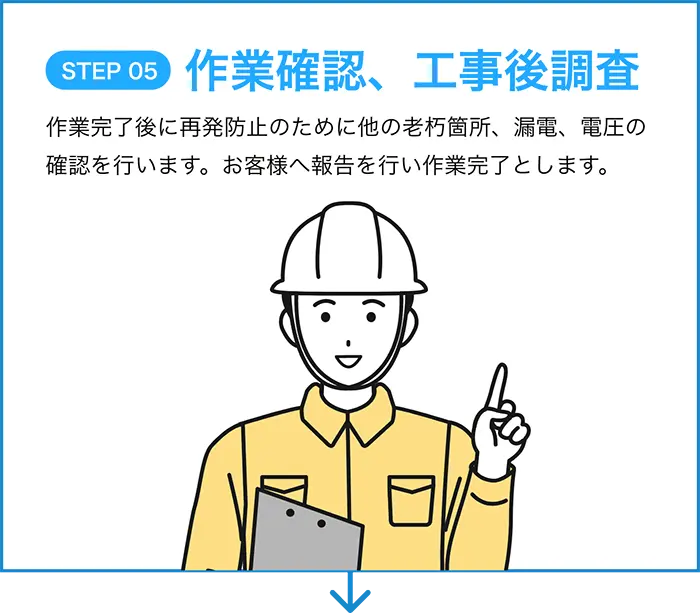 調査は1~2時間程度がほとんどです。工事は内容により大幅に変化します。
